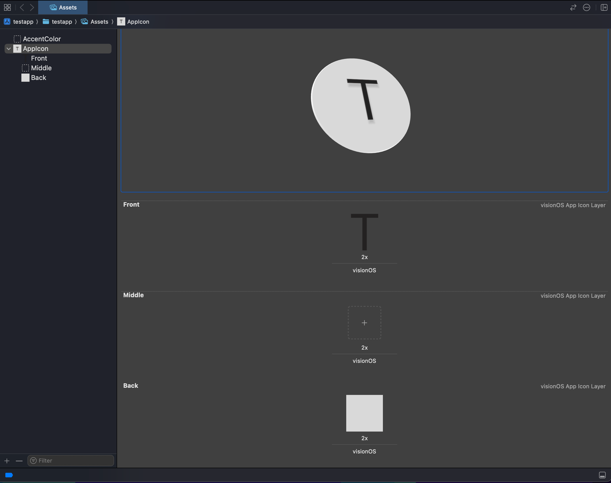 If you need a visionOS icon, you'll need at least two layers to create the 3D effect. The way I did that when I was starting out is to open Figma (or your tool of choice), add a 1024 x 1024 rectangle or circle as the background and an icon or some text on top of it as the foreground. I'd then export the foreground and background as two separate layers and use that. Not the most elegant solution, but it worked!