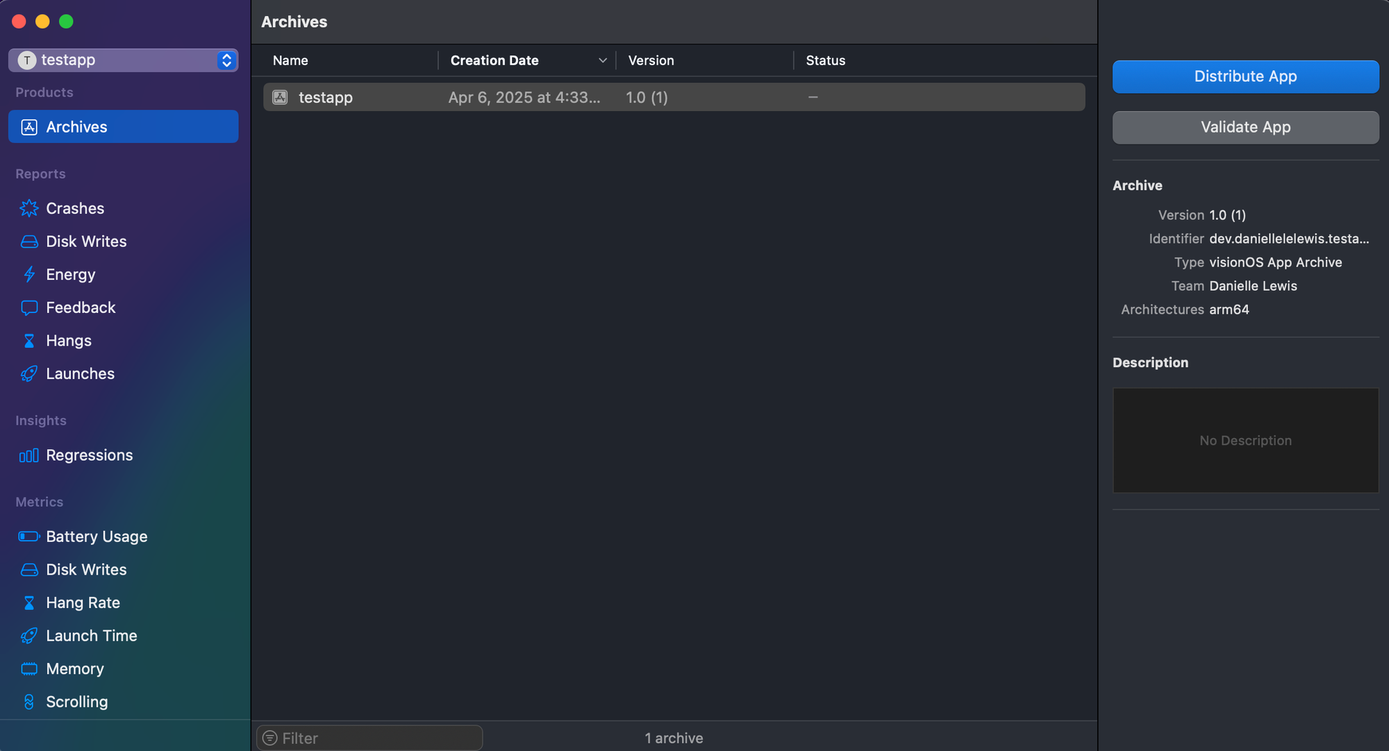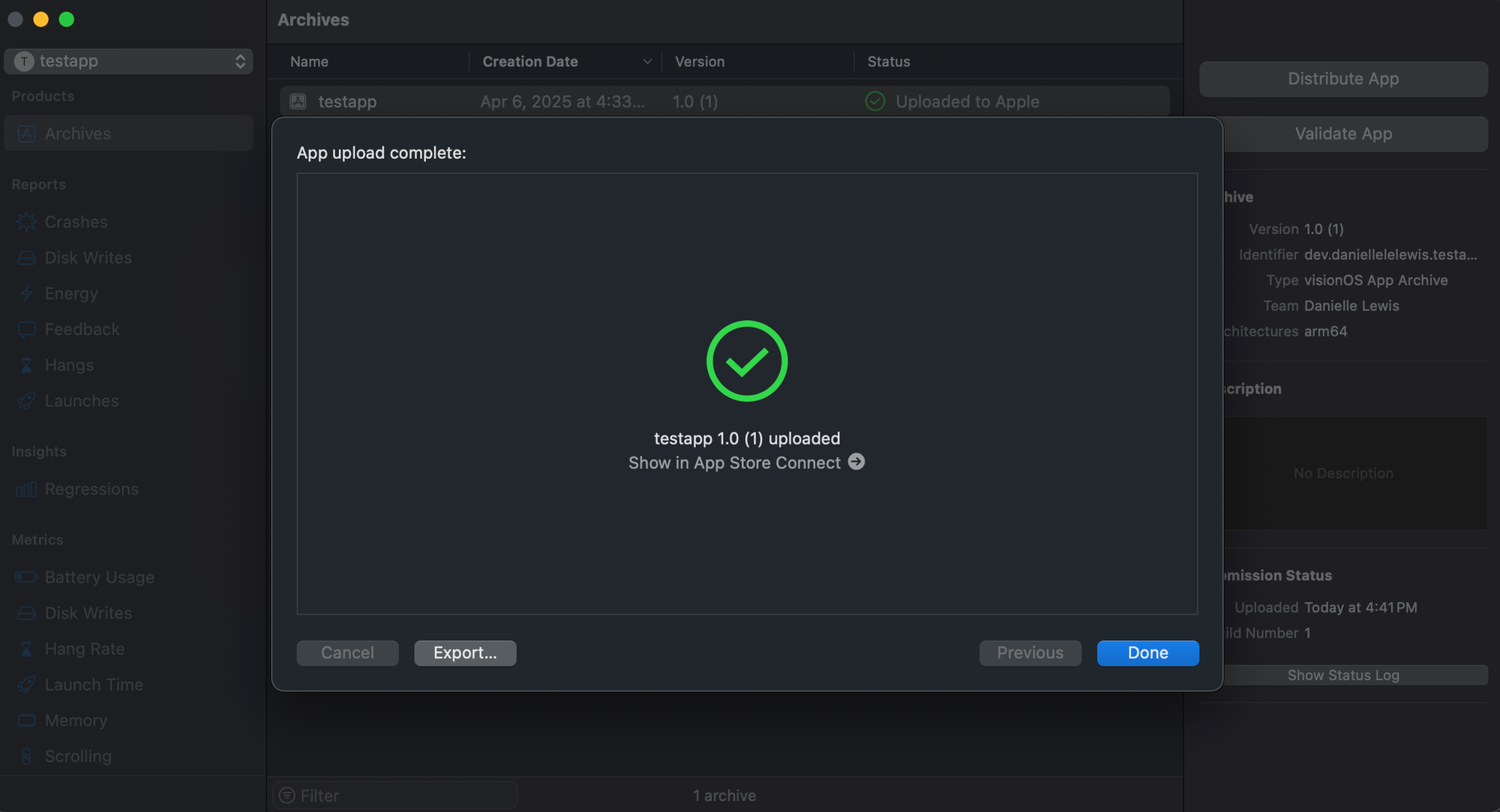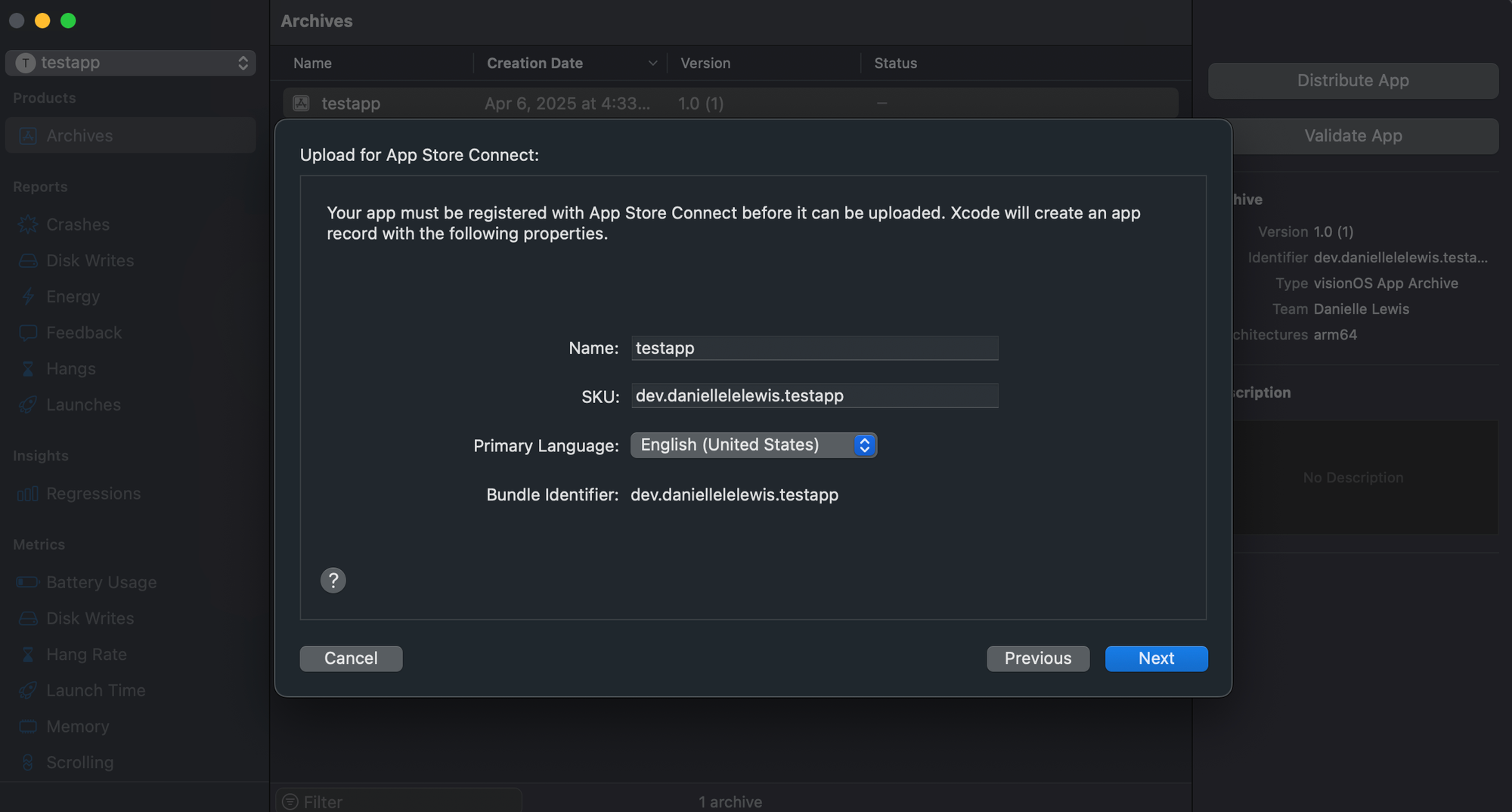 Once your app is successfully uploaded, you may need to wait anywhere between a few seconds to a few minutes for it to appear in App Store Connect. Log in and under the Apps menu, you should see your app. I had to rename mine since testapp was already taken.