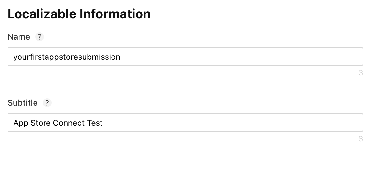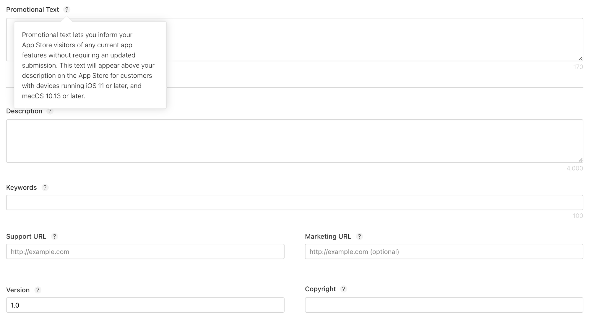 If you want some more context for what each of these fields are for, clicking the question mark icon next to the field name will provide additional details. All of these fields shown above are required except for the Promotional Text and Marketing URL.