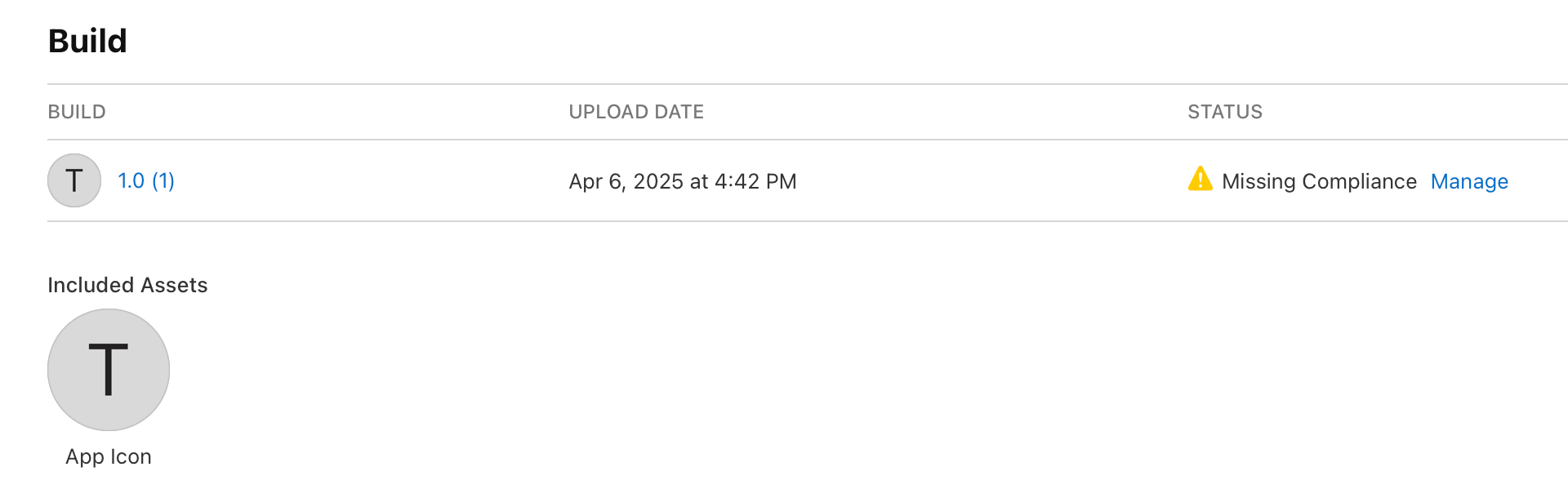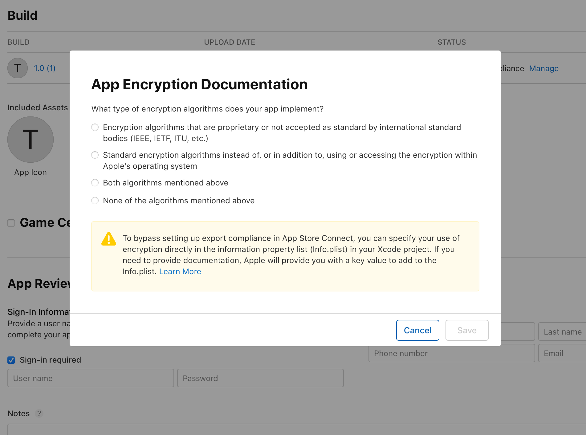 Clicking "Manage" next to the Missing Compliance warning will bring up a window for you to specify what type of encryption algorithms your app implements. My app does not implement and encryption algorithms so I will select "None of the algorithms mentioned above" and click save. If your app uses encryption, be sure to select the correct option here.