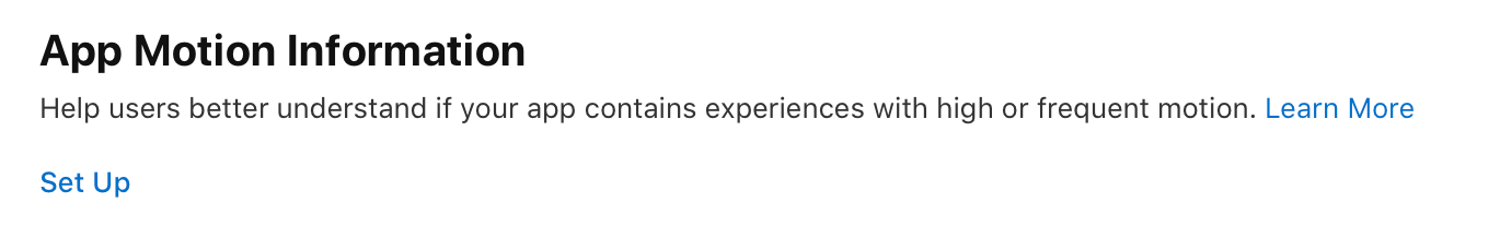 Next, we have to specify if our app contains high or frequent motion so that Apple can warn users who may be sensitive to that for any reason. Just click the "Set Up" link and choose Yes or No.