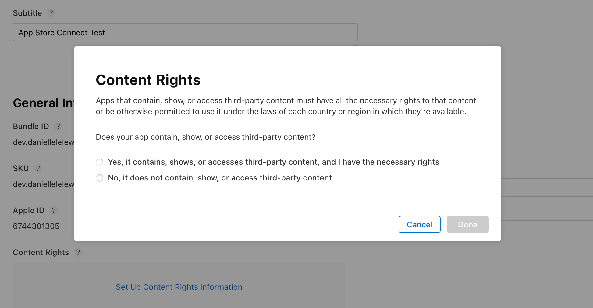Next, we have to set up our app category and content rights information.