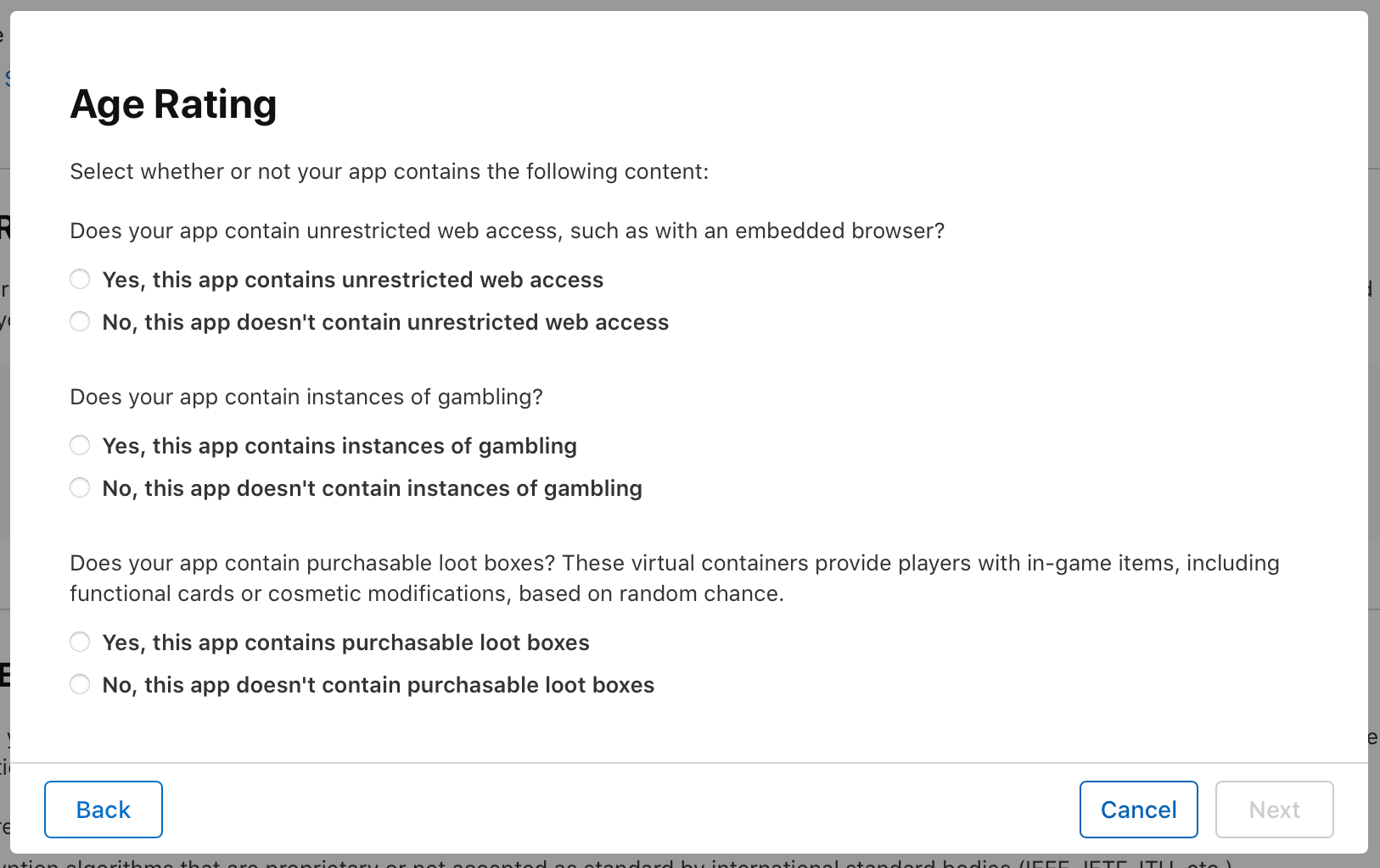 The last piece of required information on this page is the Age Rating. There will be several different content descriptions and you will have to choose the frequency of this content in your app. Then you'll have to tell them whether you app contains unrestricted web access, gambling, or purchasable loot boxes. Finally, you can optionally specify if the app is intended for a certain age group. After you give them all of this information, they will choose an age rating for you.