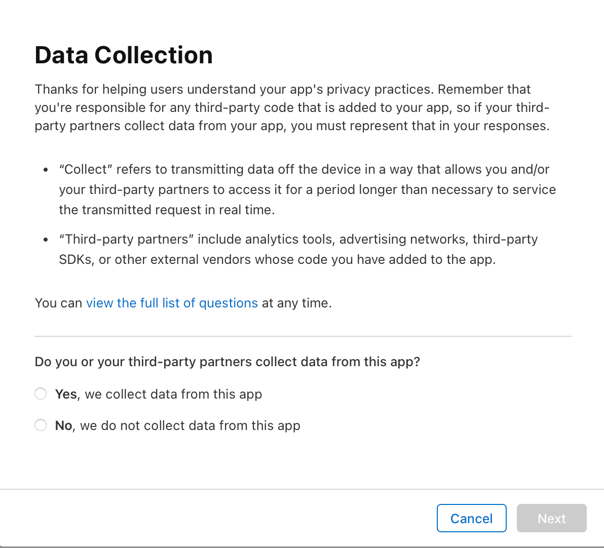 Next, hit the Get Started button to declare your app's data collection practices. Be sure to consider if you are using any third-party APIs in your application as they may be collecting data even if you personally are not.