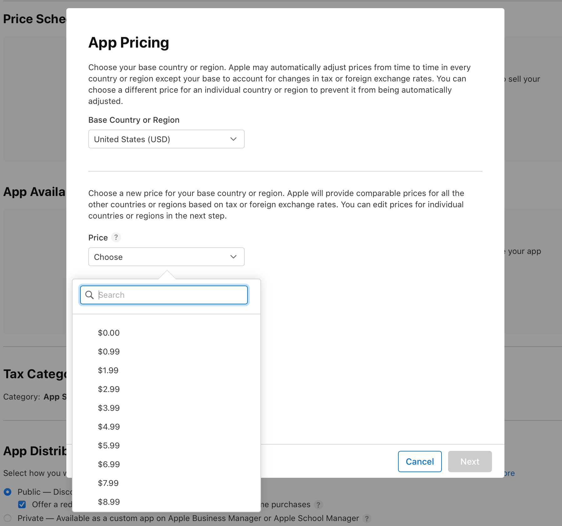First, let's set up the price. Click the Add Pricing button. Much to my dismay, we can only choose a price from this dropdown list. If you scroll to the bottom of the dropdown, there's a "See Additional Prices" button that will give you more options. I really wanted Cannoisseur to be $4.20 but they really ruined my fun by not allowing that as an option. Choose your pricing and your base country for tax and foreign exchange rates. Once you hit Next, you'll be able to set custom pricing for different regions if you want to. Hit Next again and confirm that your pricing information is correct. This can be changed later if you'd like, so don't worry if you decide you want something different later.